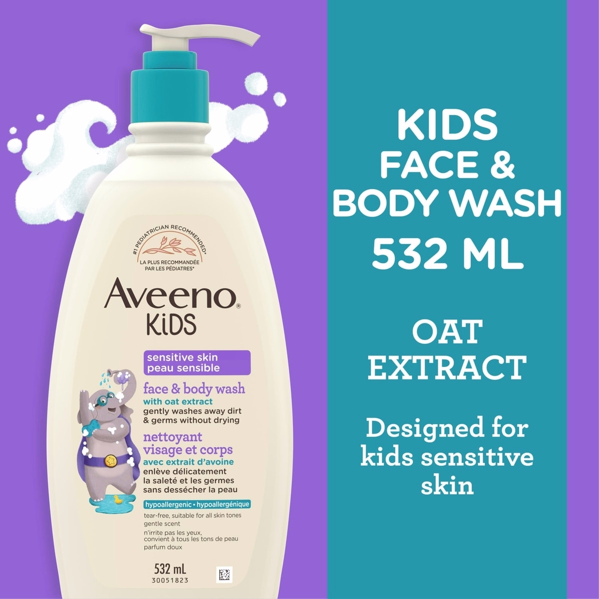 Il combine le nettoyage du visage et du corps en un seul produit, utilise une formule à l’extrait d’avoine pour l’hydratation et est formulé pour être hypoallergénique et sans larmes, sans phtalates, sulfates, colorants ou phénoxyéthanol.