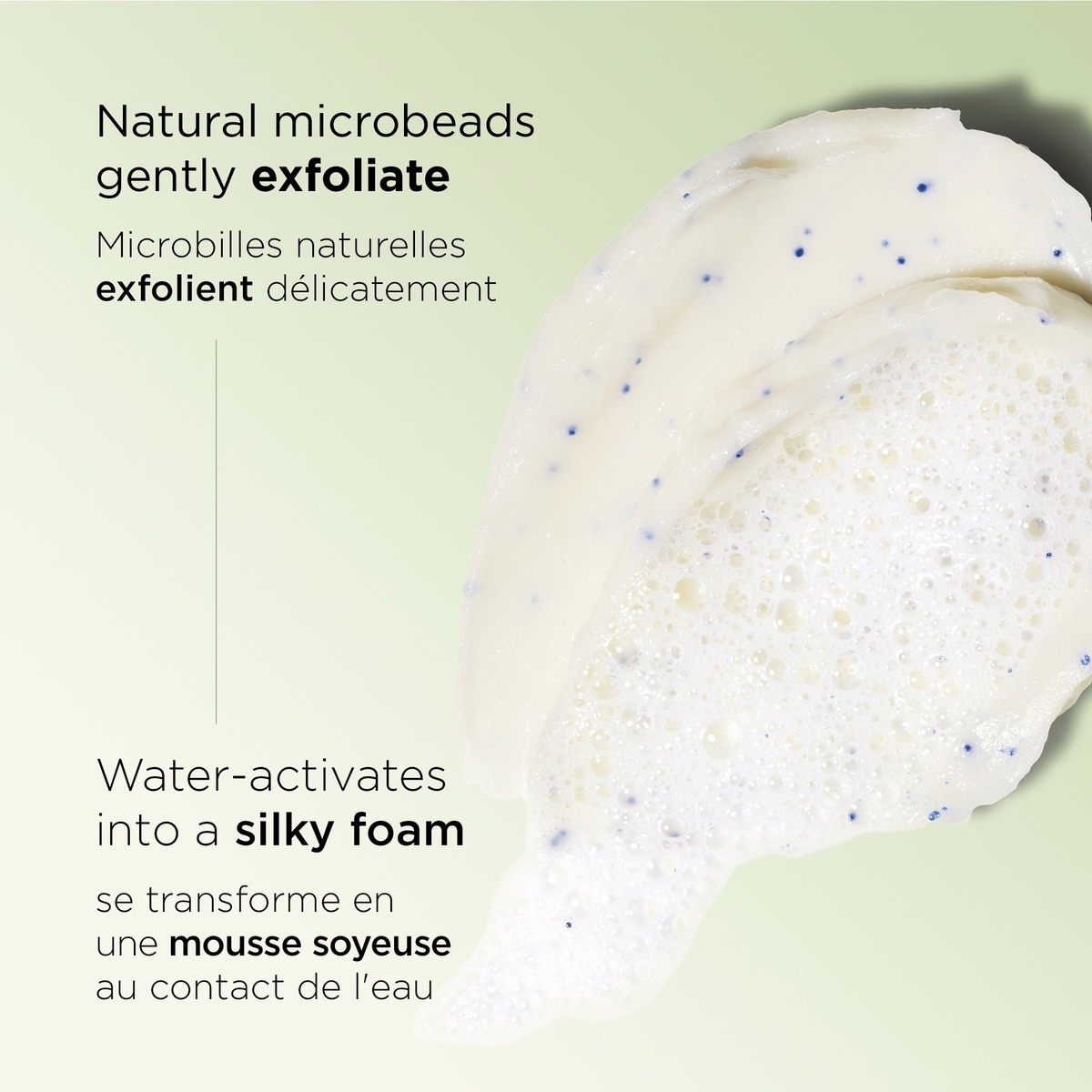 - Des micro-billes botaniques transforment la texture en une mousse légère et agréable pour un nettoyage en douceur.