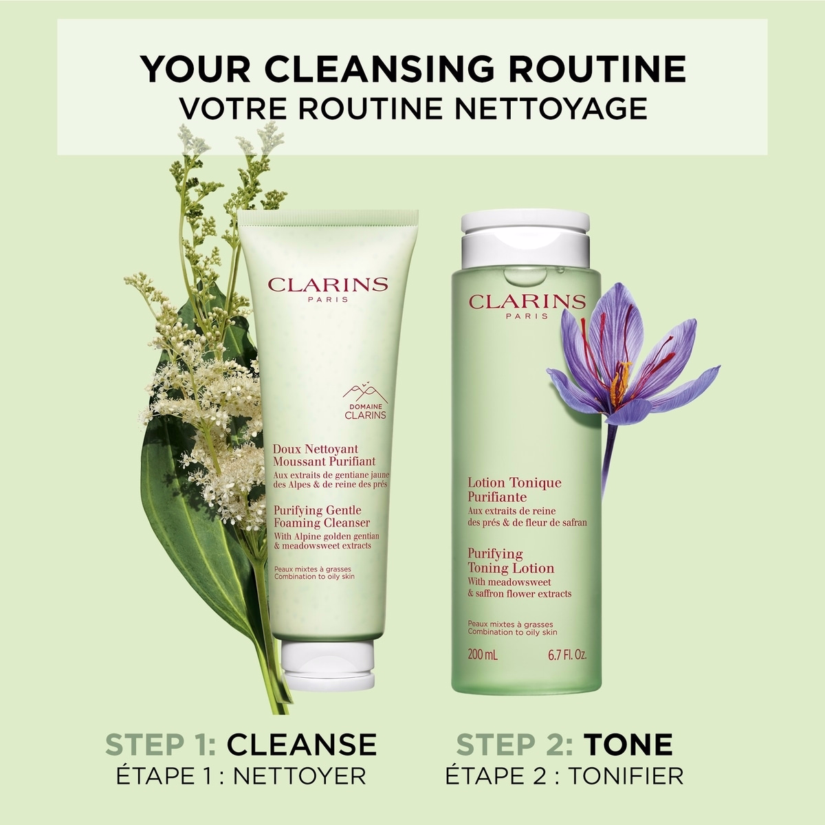 Purifying Gentle Foaming Cleanser de Clarins aide à équilibrer et purifier les peaux mixtes à grasses tout en démaquillant et éliminant les impuretés. Ce nettoyant moussant présente des extraits d’herbes alpines du Domaine Clarins et un Complexe Doux avec de la gentiane jaune biologique et de la mélisse pour apaiser et assouplir la peau. La formule contient de l’extrait de moringa pour prévenir l’adhésion des impuretés à la peau, offrant une texture fraîche et crémeuse qui se transforme en une mousse légère. Une refonte éco-responsable propose un tube encore plus durable et une capsule plus légère, sans compromettre l’efficacité. Ce nettoyant est conçu pour un usage quotidien sur une peau nettoyée et soutient un teint clair et équilibré.