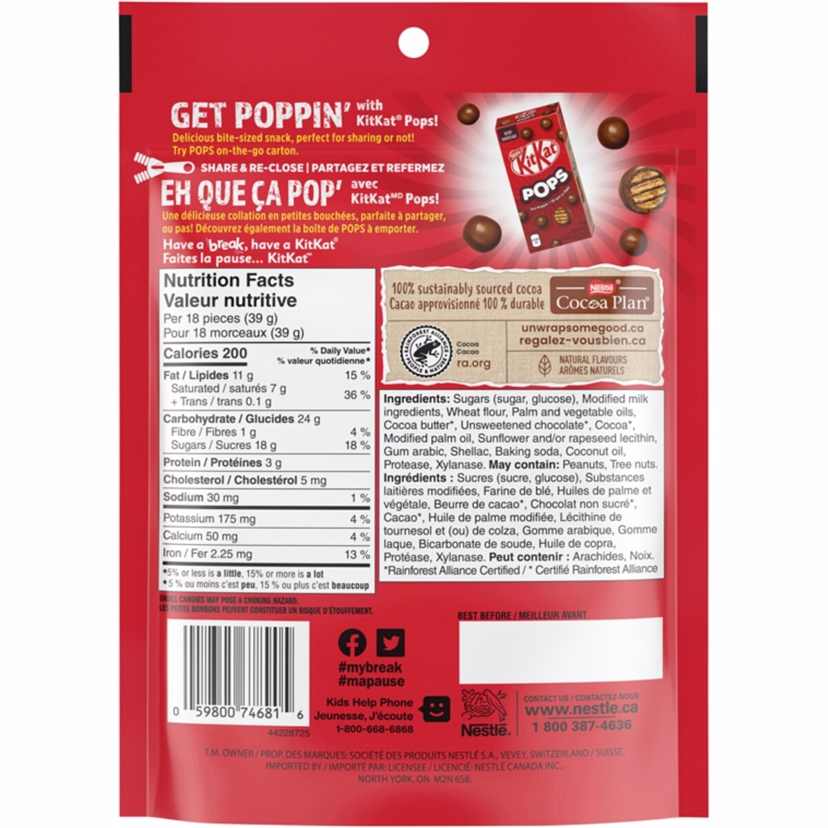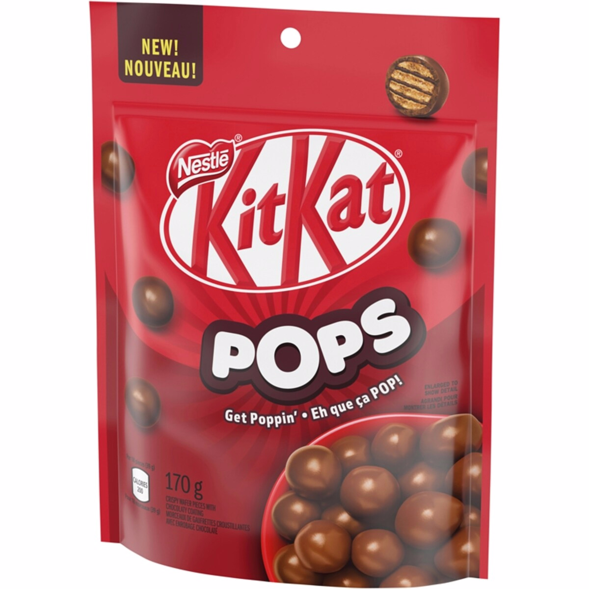 Les KitKat Pops Snacks Chocolat au lait présentent des wafers KITKAT croustillants enrobés d’une couche chocolatée. Le produit utilise des arômes naturels pour offrir un goût et une texture KITKAT cohérents et reconnaissables sous leur forme en bouchées. Ces composants travaillent ensemble pour procurer un croquant satisfaisant et une finition chocolatée lisse à chaque pièce.