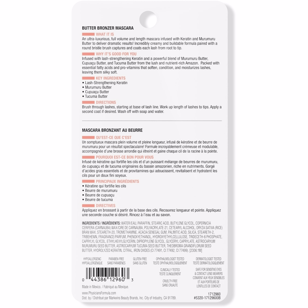 Le mascara est formulé pour un usage général et comprend de la kératine fortifiante des cils et un mélange de Beurre. Si vous avez les yeux sensibles ou portez des lentilles, testez sur une petite zone puis cessez l’utilisation en cas d’irritation. Rincez au savon et à l’eau si nécessaire.