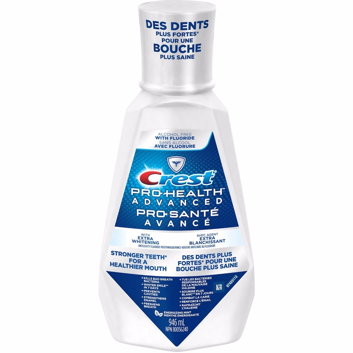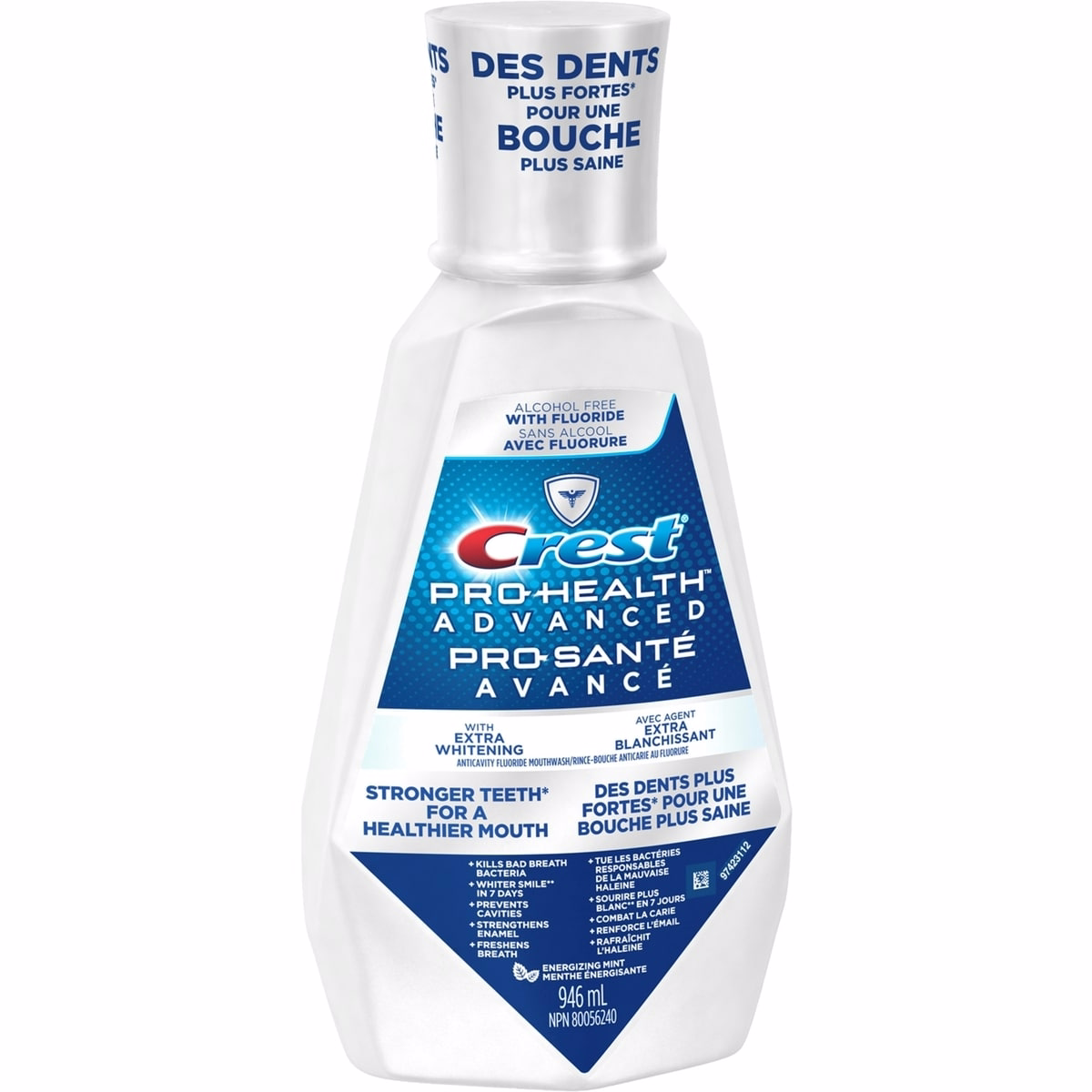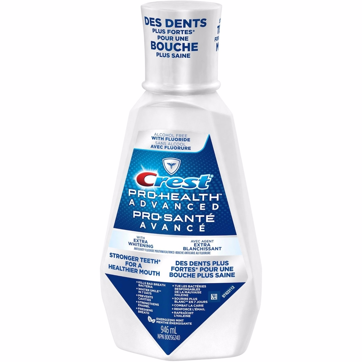 Crest Pro-Health Advanced Extra Whitening Mouthwash, 946 mL は、エナメル質を強化し、息をさわやかに保ち、ブラッシング習慣の一部として使用した場合に安全に歯を白くします。このオーラルリンスは、虫歯予防機能とともに追加のホワイトニング効果を求める、12歳以上の大人とティーンの健康な歯茎をサポートします。