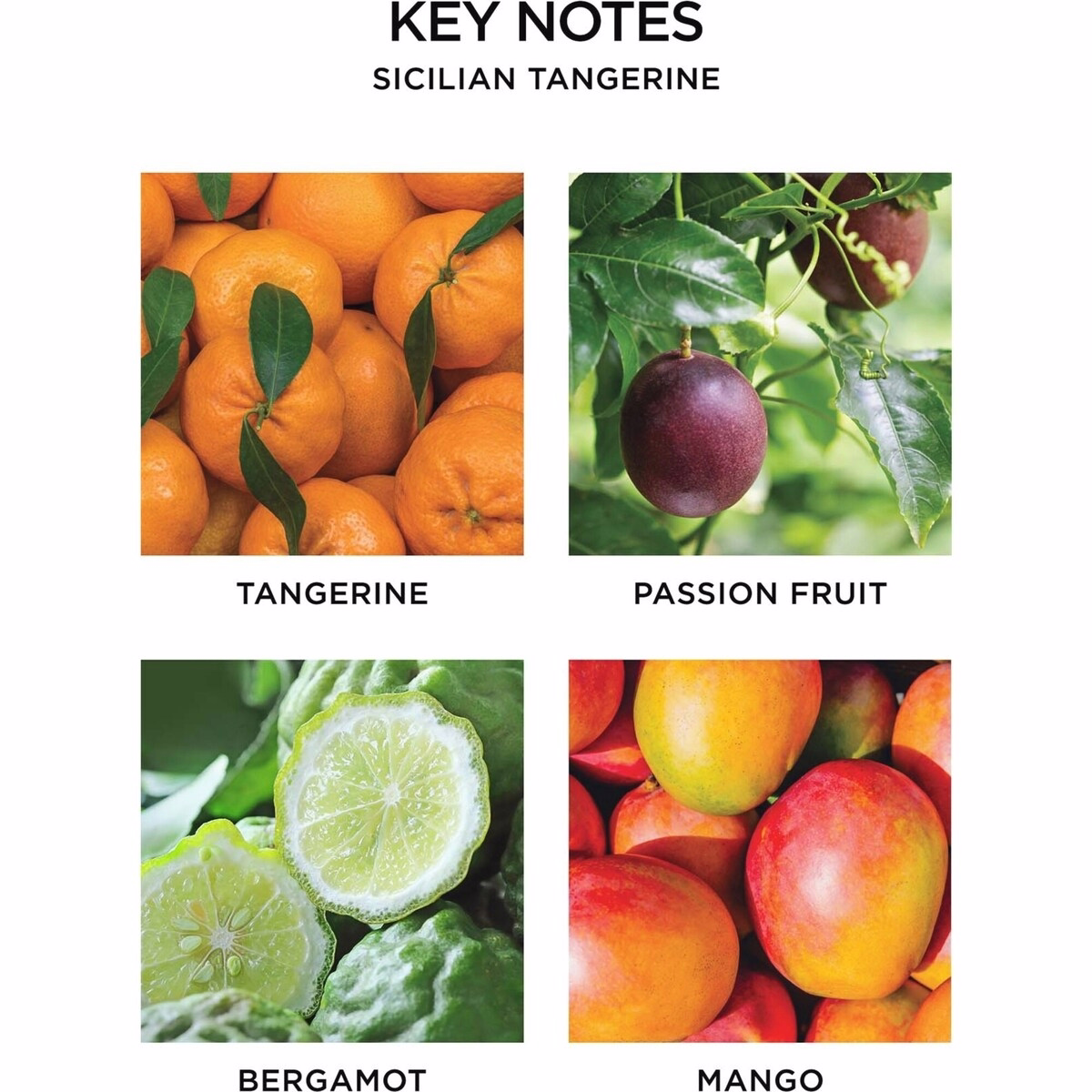 主な香りのノートはシチリアンタンジェリン、ベルガモット、エキゾチックマンゴー、パッションフルーツで、明るく高揚感のある柑橘系トロピカルの香りを作り出します。