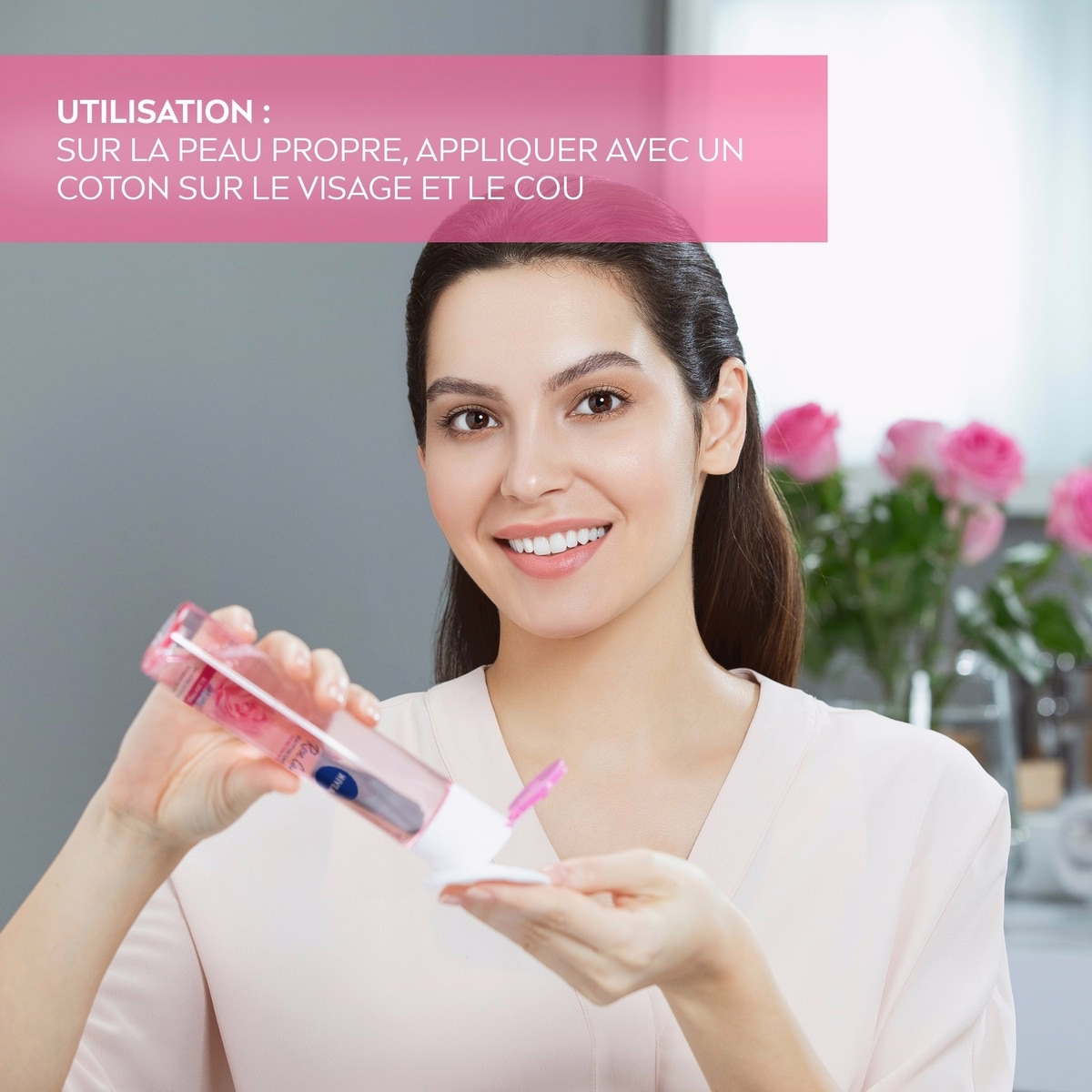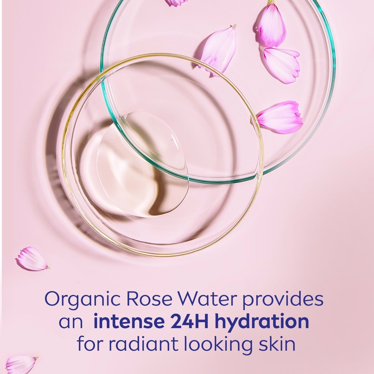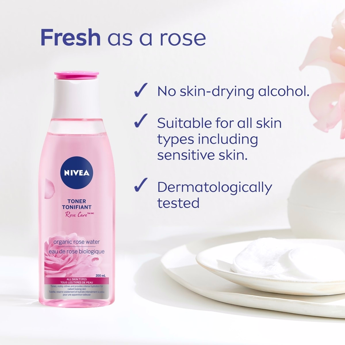 NIVEA ローズケア トナー 全肌タイプ用 | 肌を乾燥させるアルコール不使用のフェイシャルトナー | NIVEA トナーは毛穴を引き締めるトナーで、毛穴を視覚的に整えます | 200 mLは毛穴を整えつつ肌を柔らかく、さっぱりと潤いのある状態に保つよう設計されています。この処方は有機ローズウォーターを使用して輝く印象を与え、24時間の保湿をサポートします。敏感肌を含む全肌タイプに適しており、手早いスキンケアルーティンで信頼できる選択肢です。