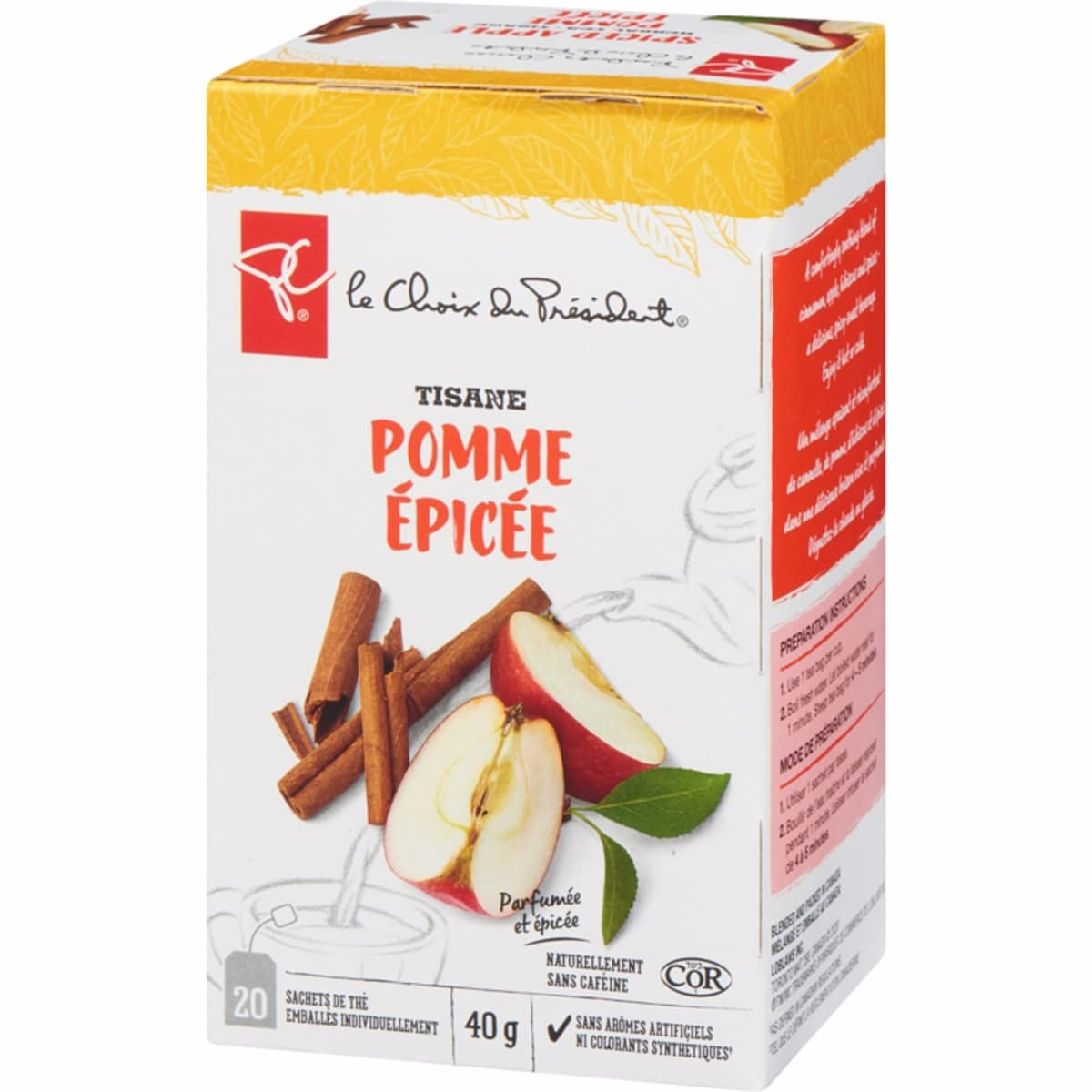 President’s Choiceのスパイスドアップル ハーブティーは、寒い季節の安らぎの瞬間を楽しむために設計された自然なカフェインフリーのブレンドです。このハーブティーはリンゴ、柑橘、シナモン、クローブを組み合わせ、活気があるのに落ち着く香りと風味を生み出し、砂糖不使用の心地よいおやつをいつでもお楽しみいただけます。