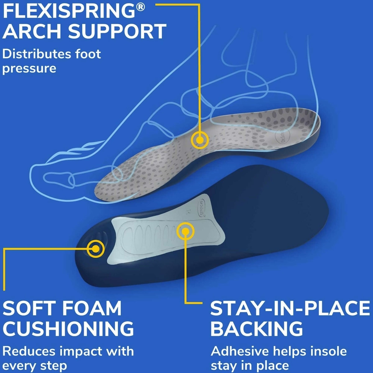 - FlexiSpring 아치 서포트 — 발 압력을 분산시켜 발 중간부 전체에 고른 지지를 제공합니다.