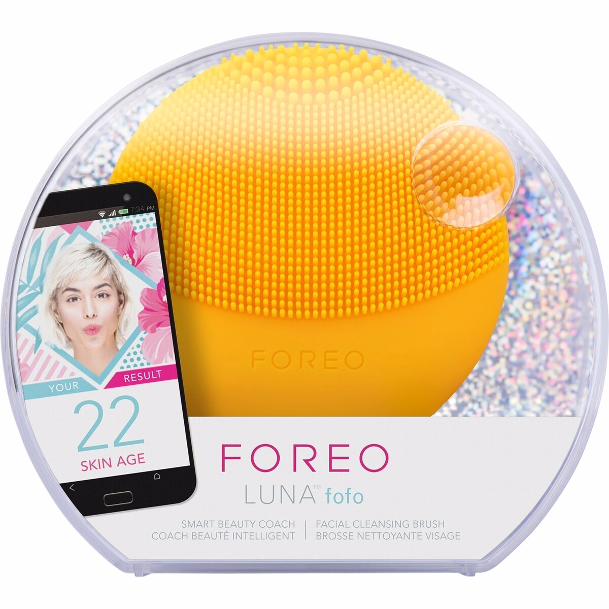 The LUNA Fofo Sunflower Yellow is an app-driven facial cleansing brush with skin analysis. It measures moisture with dual sensors and delivers a 90-second cleansing routine via the FOREO app, helping you customize your skincare journey in 1 Unit.