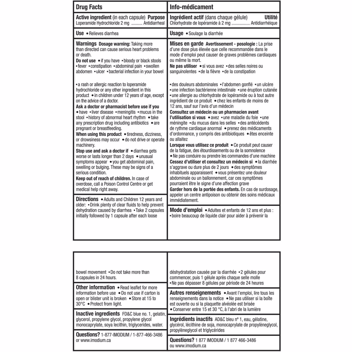 퀘벡 주 규정은 약사 소유주가 약물이나 약국 업무와 관련된 활동에 보너스 포인트를 부여하는 것을 허용하지 않습니다. 설사 증상의 빠르고 효과적인 완화를 원하면 IMODIUM® LIQUI-GELS®를 사용하세요. 각 섭취당 로페라마이드 하이드로클로라이드 2 mg이 들어 있어 여행자 설사를 포함한 모든 설사 발작에 적합합니다. LIQUI-GELS®는 단 한 번의 복용으로 설사를 완화하는 경우가 많아 증상을 가라앉히고 평온함을 되찾는 데 도움을 줍니다. IMODIUM® LIQUI-GELS®는 락토스-프리이며 6, 12, 24, 36 또는 60개의 액상 젤로 구성된 패키지로 제공됩니다.임상 연구에 따르면 초기 복용 후 설사 조절은 50%의 환자에서 달성될 수 있습니다.