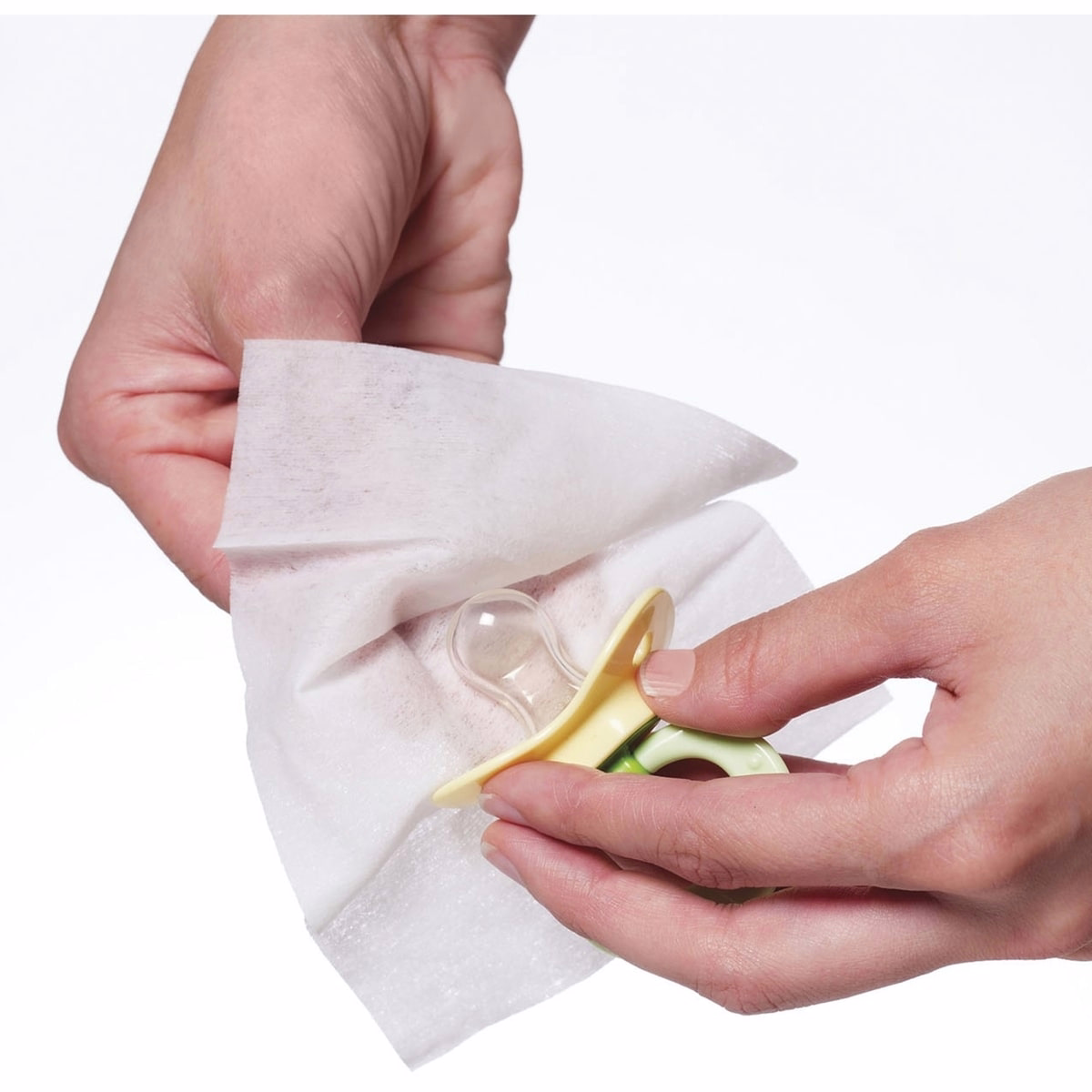 젖꼭지, 잇몸 완화용 물건, 병, 컵, 장난감 또는 식기를 물티슈로 닦아 깨끗해질 때까지 닦습니다.