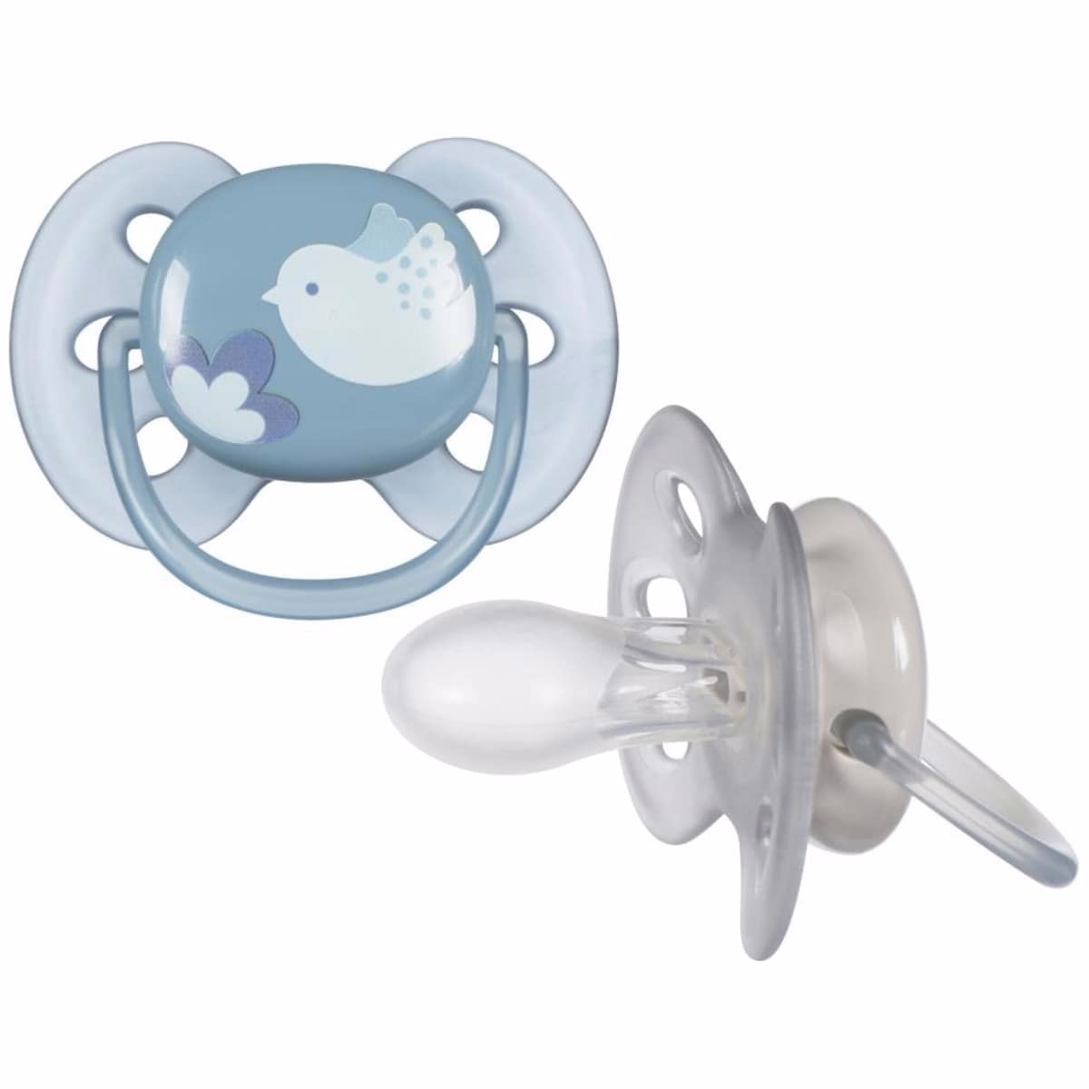 The Ultra Soft Pacifier 6-18m blue dove / silver leaf from Avent is designed to comfort babies while protecting delicate skin. This 2-pack features a soft silicone nipple and a flexible shield to reduce marks and irritation, making it a gentle option for your little one.