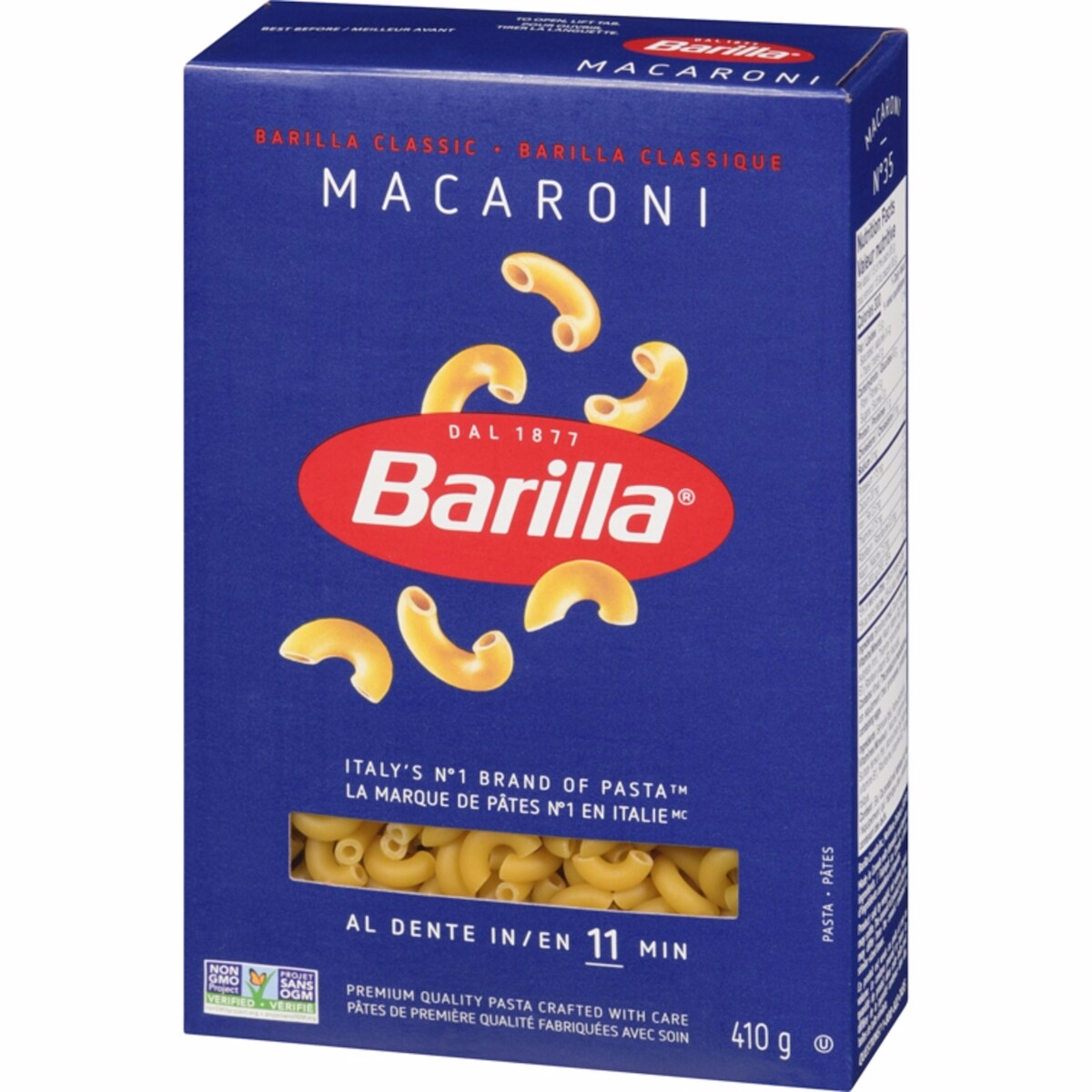 The product is Barilla Pasta Macaroni N° 35 in a 410 G package. Exact ingredient details are not provided in the data; refer to the packaging for full ingredient disclosure.