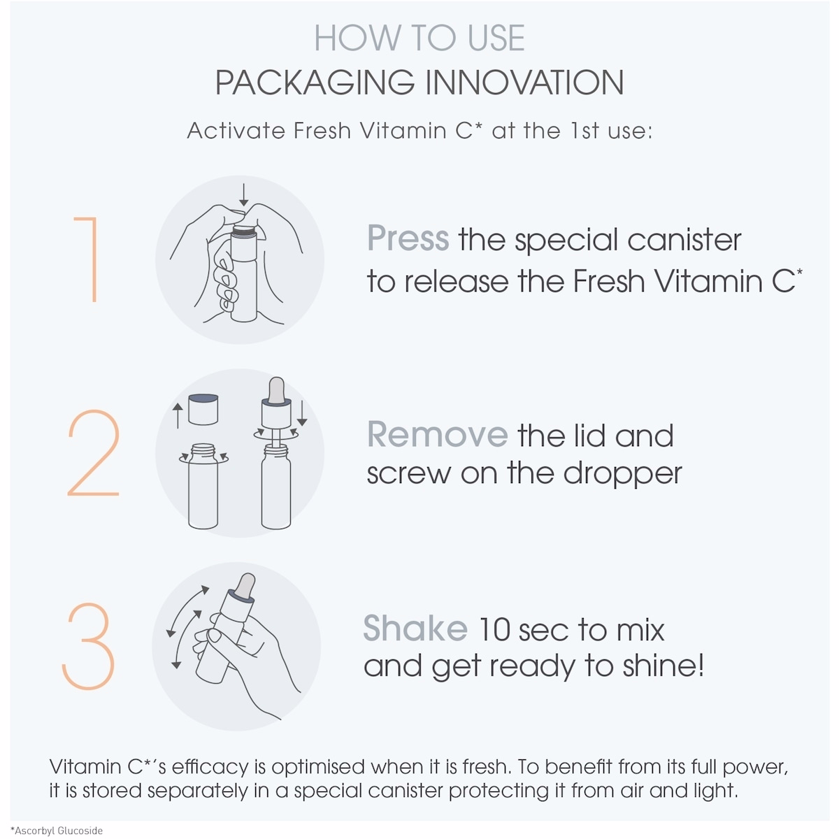 On first use, press firmly with both thumbs on the cap until the canister engages to release vitamin C. Unscrew the white cap and check that all vitamin C powder has been released. Screw on the dropper and shake for 10 seconds to mix.