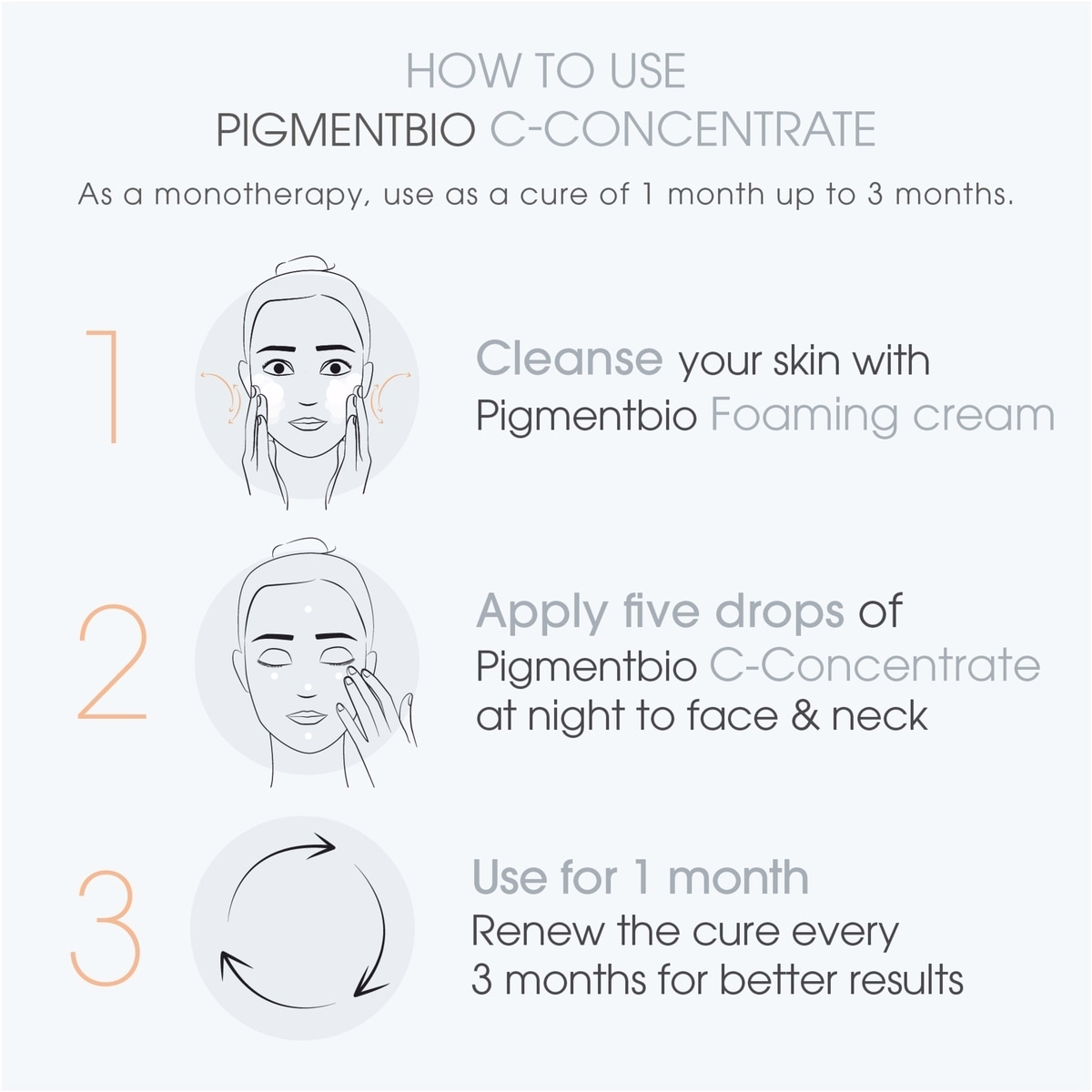 - Use alone as a cure 2x per year at a rate of 3 to 4 months each time or 1 month out of 2. Apply 5 drops every evening to face and neck after cleansing with Pigmentbio Foaming Cream. To maintain results, renew the 1 month cure every 3 months.