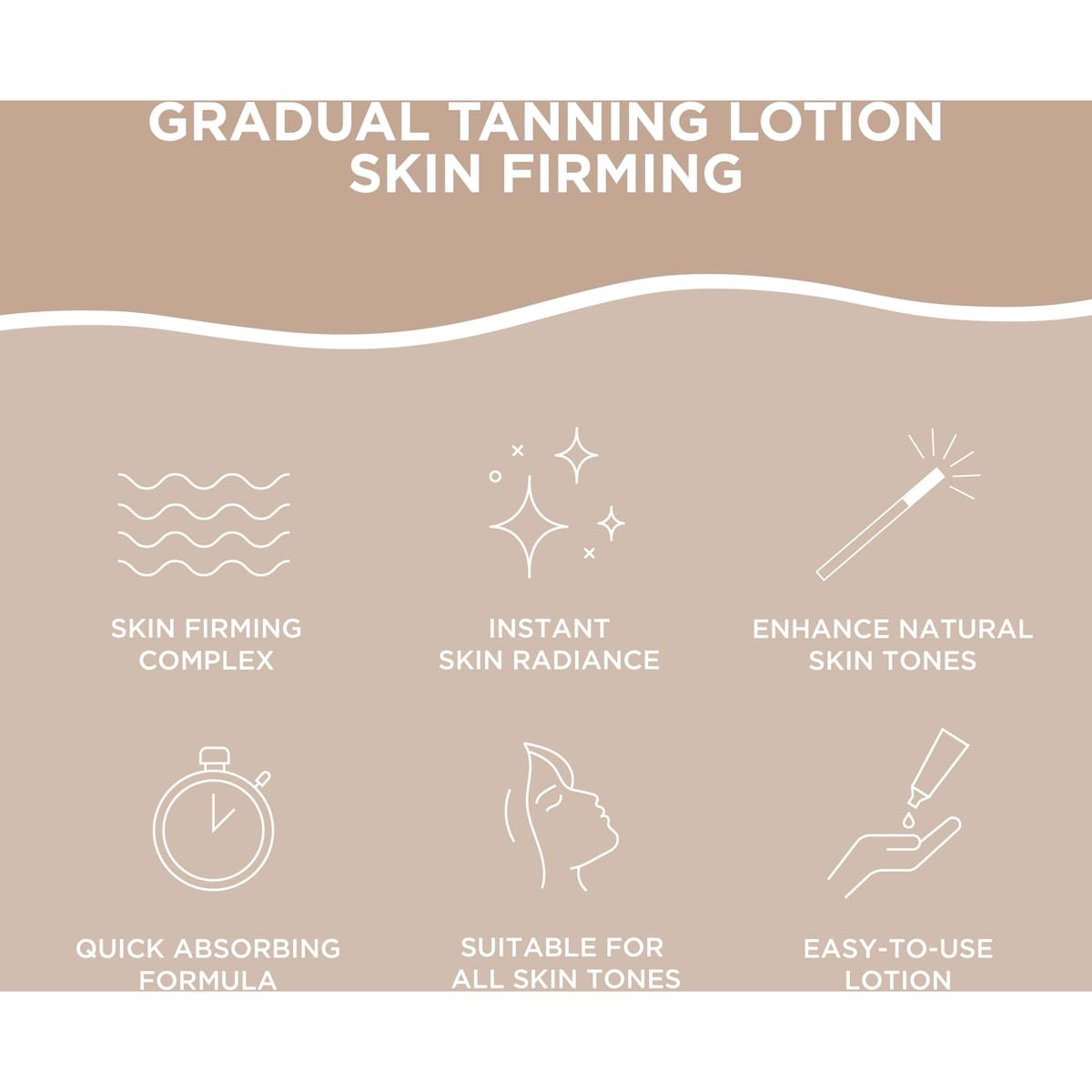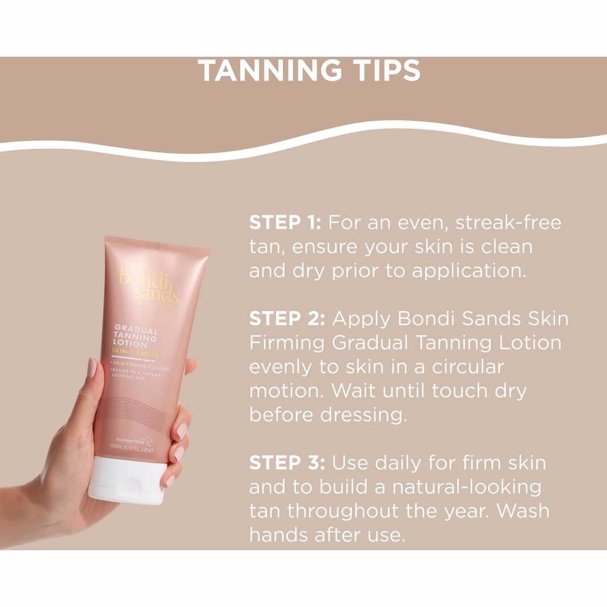 The Bondi Sands Skin Firming Gradual Tan Lotion is a daily self-tanning moisturizer designed to deliver a natural-looking tan while helping skin feel firmer and nourished. This medium variant provides a gradual glow for everyday use, suitable for all skin tones and types, with a quick-absorbing formula that supports smooth, hydrated skin as you build your color. 5.07 ML is the exact size of this product variant, with clear usage steps to help you achieve an even finish over time.