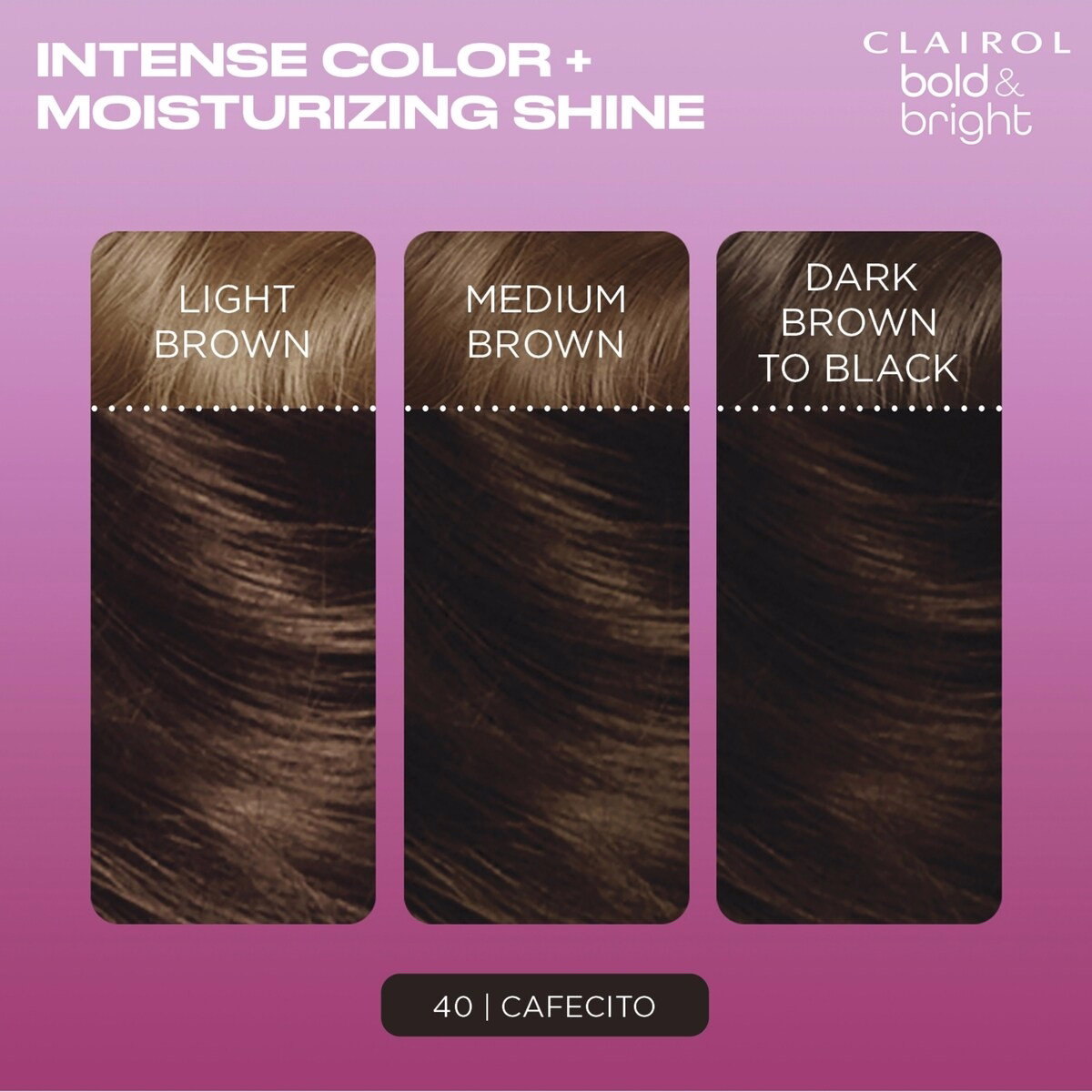 The Bold & Bright Permanent Hair Dye from Clairol delivers Intense Color + Moisturizing Shine in a single kit, designed for vibrant, long-lasting results. This variant, 50 Brown Sugar, offers a rich brown shade with a glossy finish that stays true over time. Ideal for anyone seeking bold color and a hydrated, smooth feel after use.