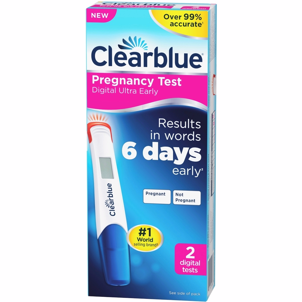 The Clearblue Pregnancy Test Digital Ultra Early 2ct is a home test designed to detect the HCG pregnancy hormone early and display results in words. This is the most sensitive digital test from the brand and can be used up to 6 days before your missed period, which is 5 days before you expect it. The test features an extra wide tip to help with sampling and a stop light that flashes when you have collected enough urine. Floodguard Technology helps ensure the test is performed correctly, while the Smart Countdown appears on screen to reassure you that the test is progressing and will show a clear digital result in words within 1-5 minutes. Like all Clearblue pregnancy tests, this model is over 99% accurate from the day you expect your period. For more information, visit the manufacturer site. 78% of pregnant results can be detected 6 days before your missed period (which is 5 days before you expect your period). Follow the included product instructions for any heating times, dosages, or specific usage guidance. Product information is provided by the product vendor and this content is a summary for informational purposes only.
