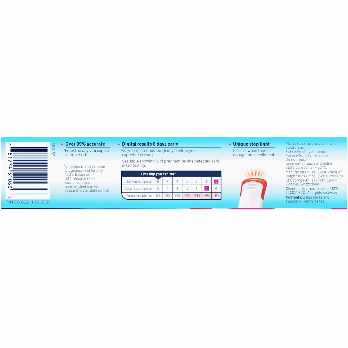 Follow the enclosed leaflet before use. Suitable for self-testing at home and for in vitro diagnostic use. Do not reuse any test. Keep out of reach of children. Store between 2°-30°C. This product is marketed for individuals who suspect pregnancy and seek a clear digital result as early as possible.