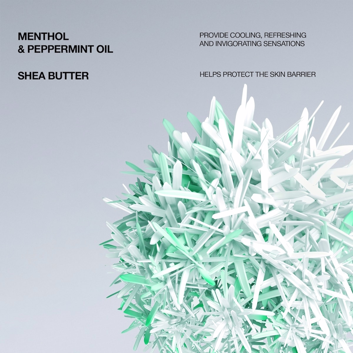 - Menthol — adds a cooling sensation on contact and helps awaken the skin during shaving.
