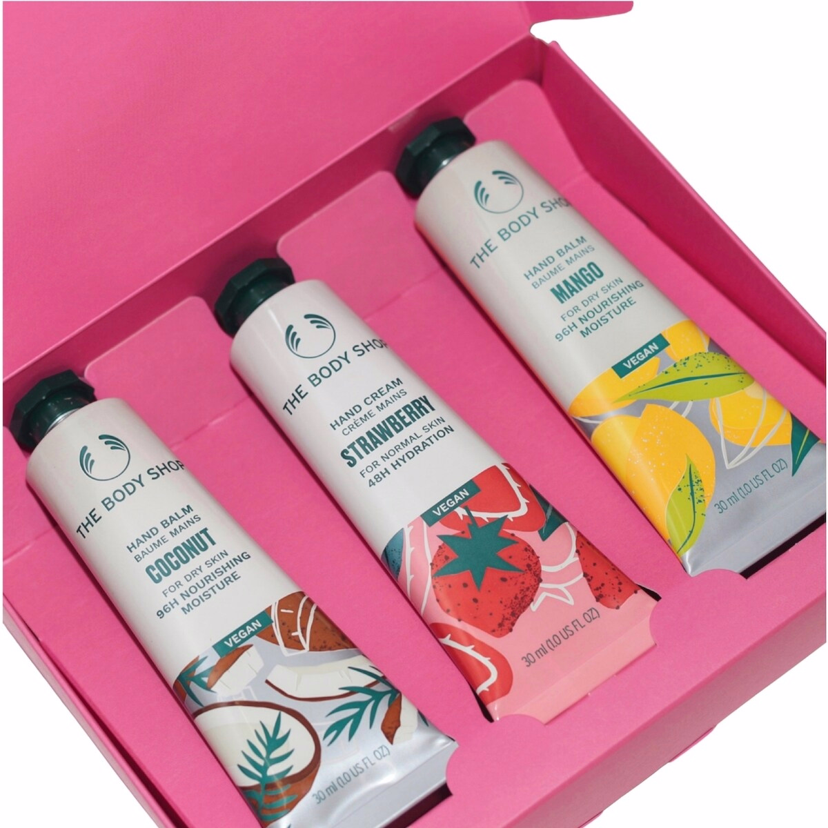 The Handcare Trio Gift from The Body Shop delivers creamy, fruity-scented, non-greasy hydration for hard-working hands in a single 1 Box set, perfect for gifting or daily use.