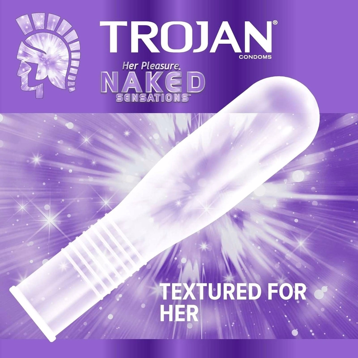 The product is a latex condom with ultrasmooth lubricant inside and out, a comfort shape, textured surface for stimulation, a tapered base for a secure fit, and electronic testing for reliability. The size is 10-Count.