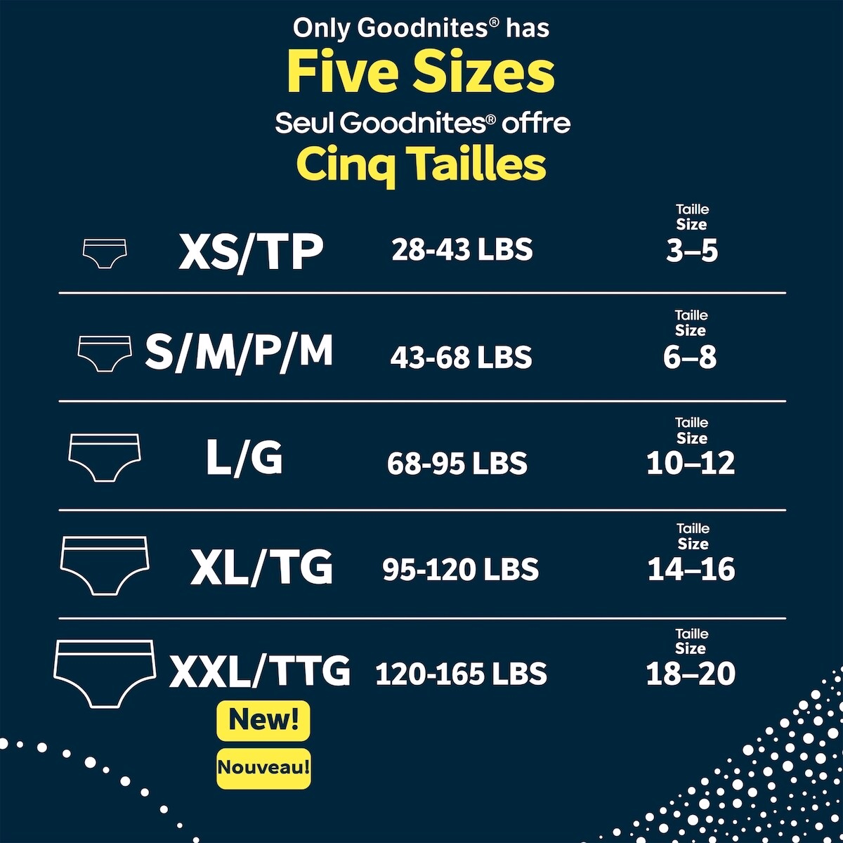 這些夜間內褲屬於完整系列,涵蓋 XS、S/M、L、XL、XXL 尺寸,適合跨越廣泛的體重範圍的兒童(XS 28-43 磅、S/M 43-68 磅、L 68-95 磅、XL 95-120 磅、XXL 120-165 磅)。如適用,於美國可享 FSA/HSA 計劃。