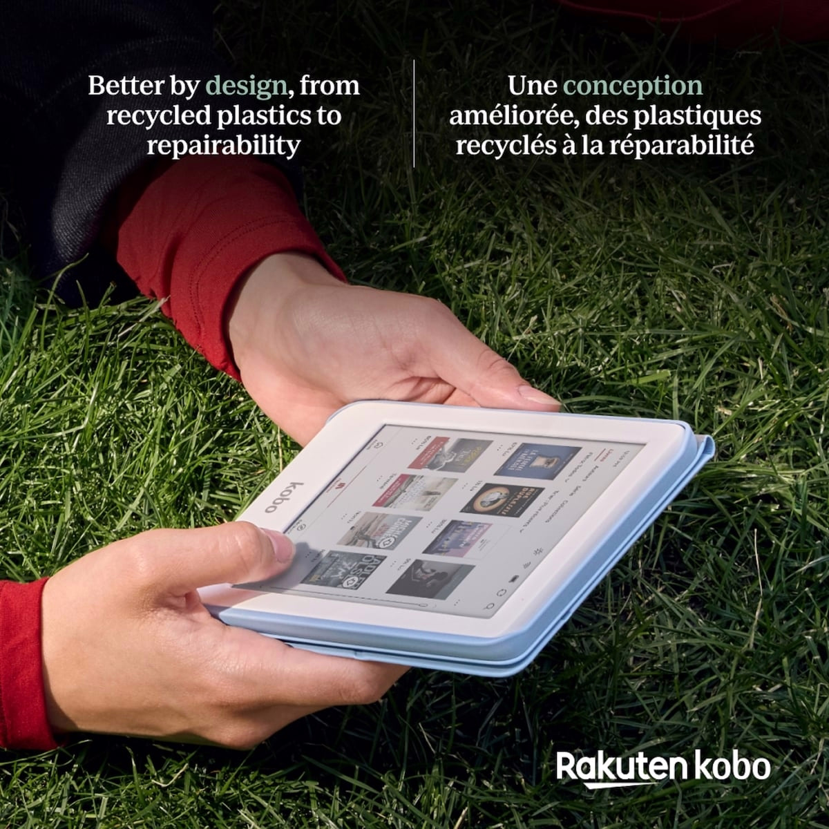 保護裝置非常簡單:防水設計可應對意外濺濕,並可利用可維修設計延長使用壽命。Kobo 生態系統提供龐大圖書館與透過 OverDrive/Libby 的借閱。