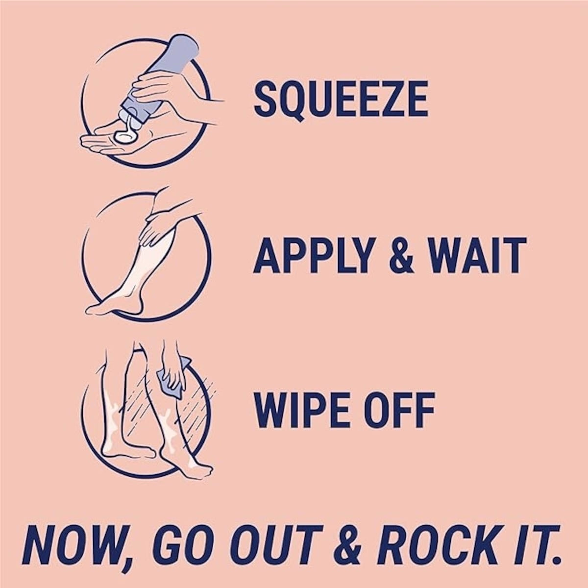 使用方法:倒轉瓶身,敲擊表面以將乳霜擠入掌心。於淋浴外塗抹厚實且均勻的一層,等待指示時間(總共不可超過 10 分鐘)。用濕毛巾輕輕擦拭後徹底沖洗。如仍有毛髮,重複塗抹數分鐘,但總時間不可超過。請遵循附帶的時機與去除指示以達最佳效果。