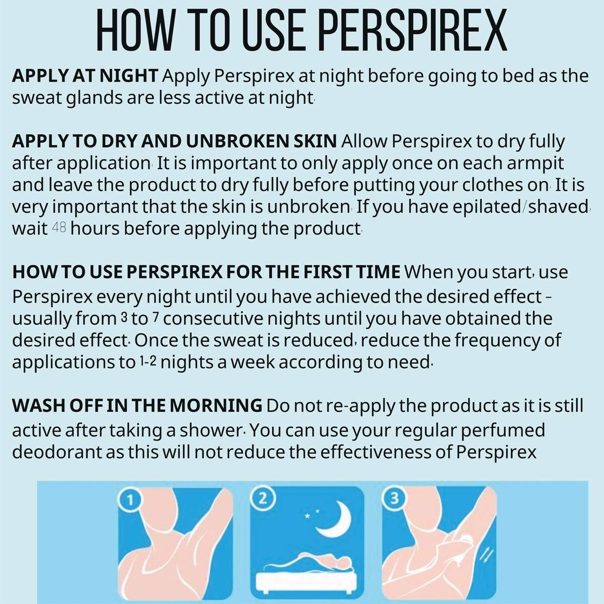 在乾淨的肌膚上塗抹,於睡前夜間使用,當汗腺活動較低時。塗抹後讓其充分乾燥。早上以肥皂及水清洗。洗澡後不需要再塗抹,因肥皂與水不會影響抗汗效果。你仍可使用香體劑或香水。若要長期保護,請每週 1-3 夜塗抹 Perspirex,或根據需要使用。
