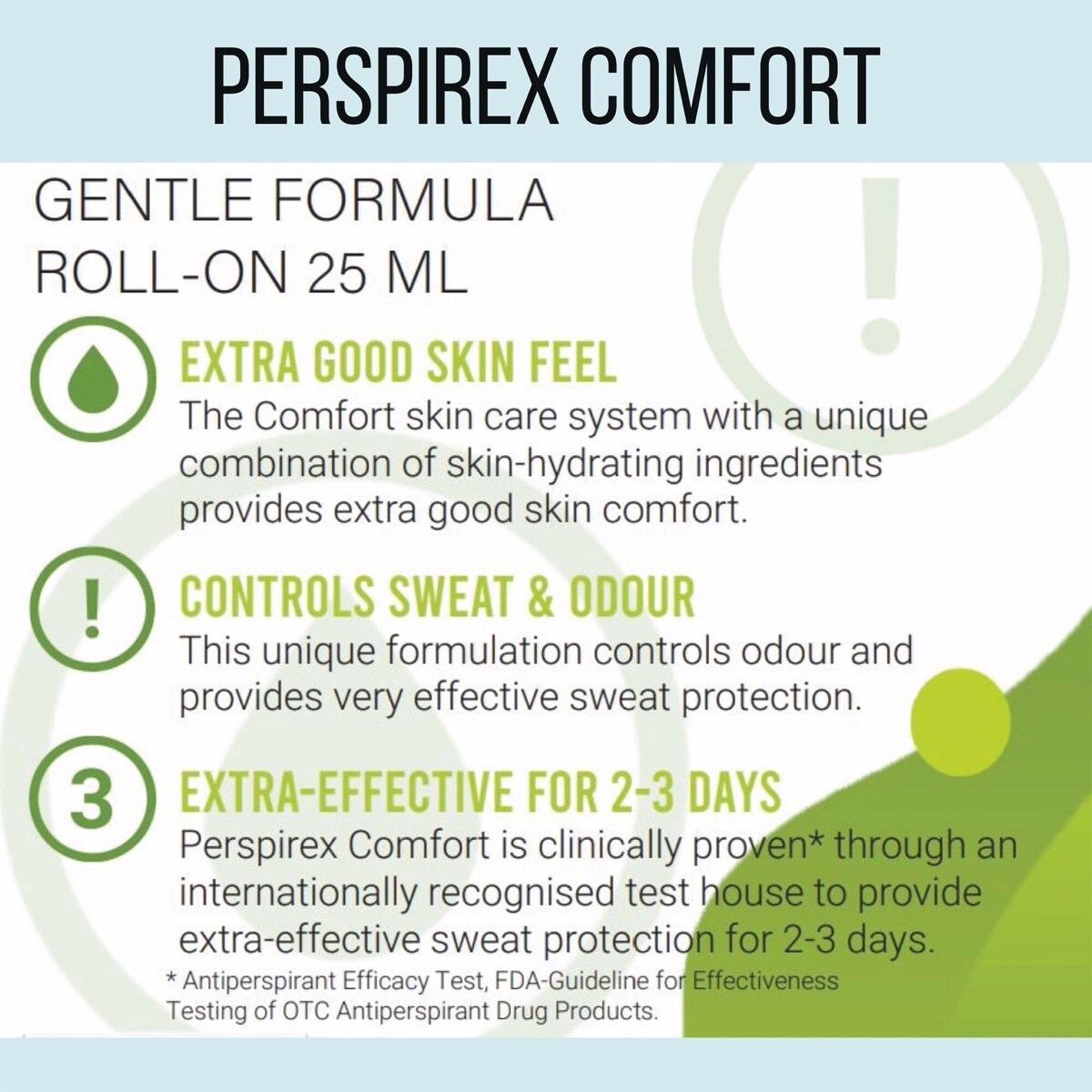 Perspirex Comfort 是為成人設計的除臭劑與止汗劑,提供有效的汗臭防護。25 mL 配方採用 Comfort 護膚系統,含有能滋潤肌膚的成分,讓你在忙碌的一天也感覺舒適。本產品適用於追求持久防護、並對氣味與出汗有安適需求的成年人。