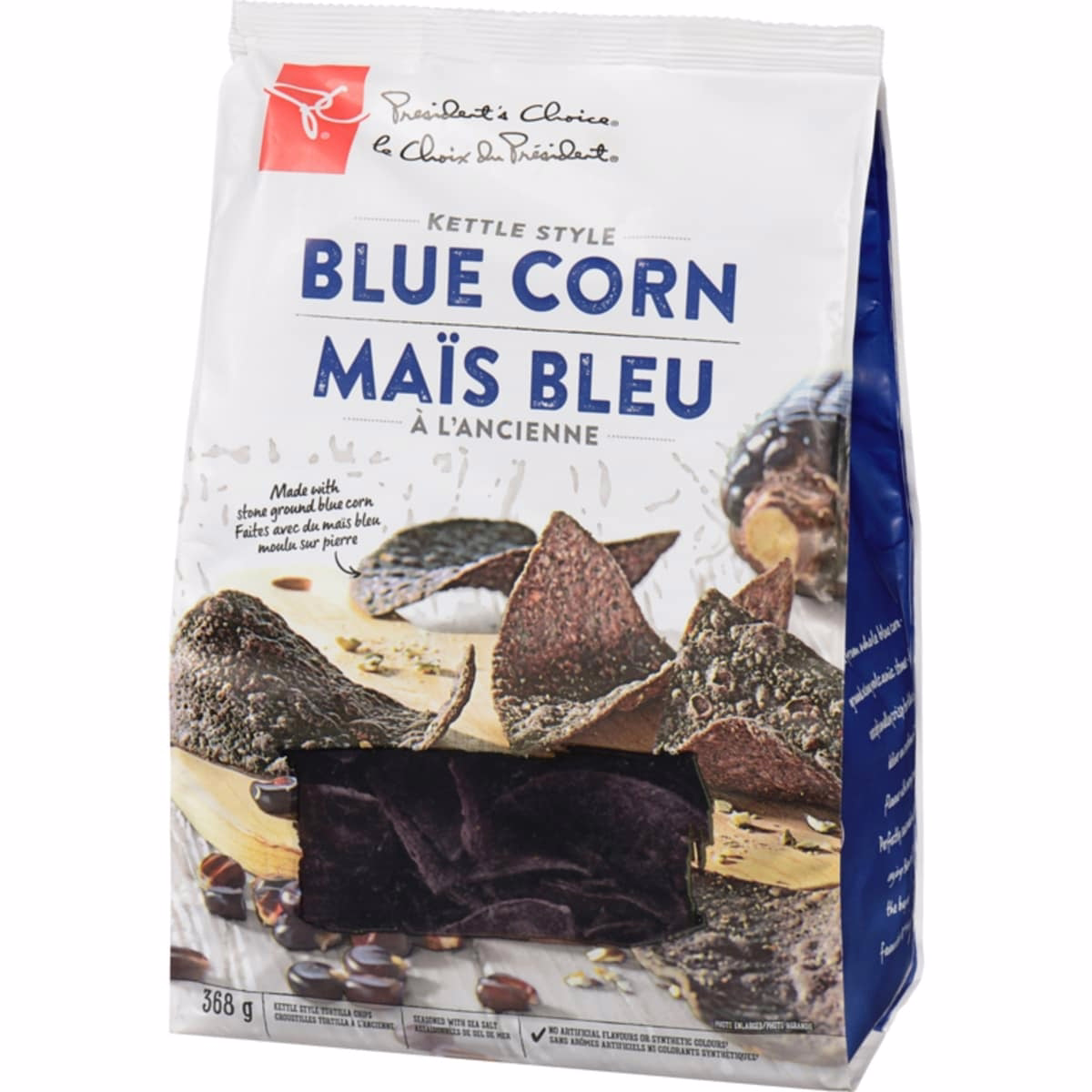 本產品是 368 g 的包裝,名稱為 鍋式風味藍玉米玉米片,海鹽調味。