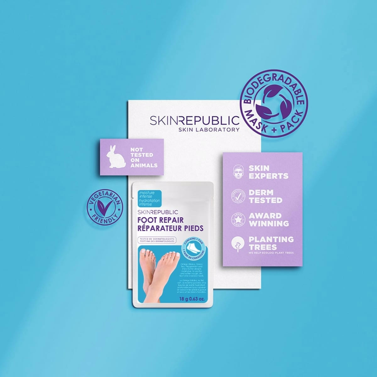 Skin Republic 的 足部修復 片狀面膜以高濃度水分滋養粗糙、乾燥的腳部與腳跟,搭配乳木果油、銀杏葉、綠茶、薄荷與海藻等滋養混合物。設計給追求更柔軟、更舒適雙足的人群,這款面膜有助於恢復皮膚養分與水分,讓肌膚明顯變得更光滑。