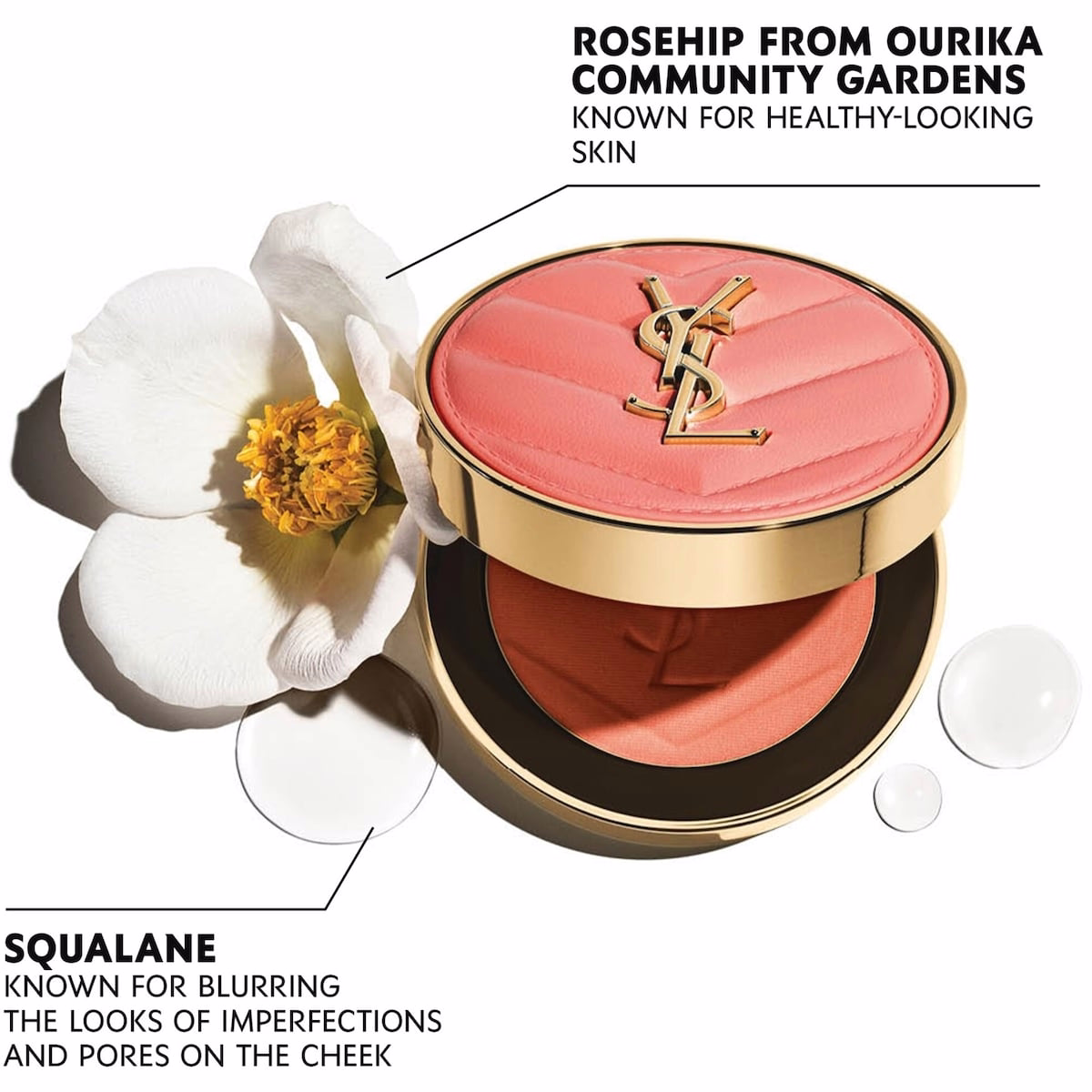 由 Yves Saint Laurent 推出的 Make Me Blush 大膽柔焦腮紅 含角鯊烷,是一款絲滑粉狀腮紅,設計讓腮紅融於雙頰、呈現無縫暈染。此可疊加配方含角鯊烷,使用時肌膚舒適,同時展現持久色彩。變體 42 – Babydoll 粉紅是八款可選色之一,提供霧面與絲光兩種妝感,能建立從柔和到大膽的個人妝容;該系列描述的重點特徵為 24 小時的活力紅暈。